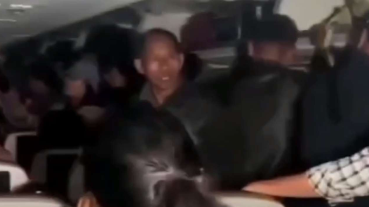 Seorang pramugara pun terlihat berusaha meminta kepada penumpang pesawat itu agar tak membuka pintu darurat tersebut.