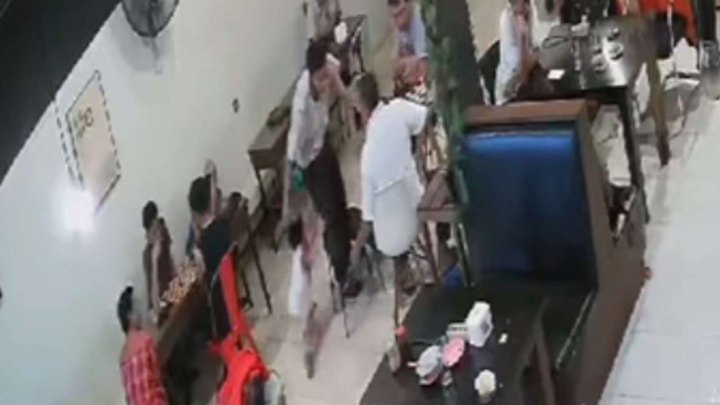 Melihat kejadian itu, ayah korban yang berada di samping meja pelaku langsung menolong anaknya itu.