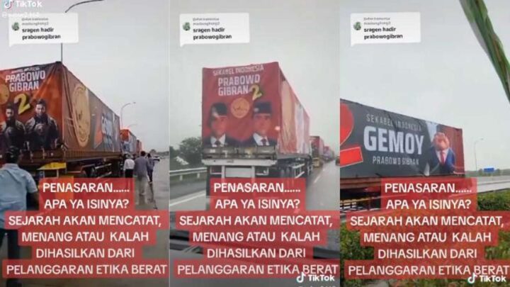 Video yang beredar pada detik ke-22 memperlihatkan iring-iringan truk kontainer yang salah satunya ditempeli banner bergambar Prabowo dan Gibran mengenakan sarung tinju, sama dengan unggahan akun TikTok sekabel.indonesia.
