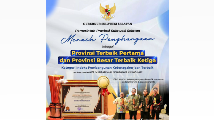 “Alhamdulillah, Pemerintah Provinsi Sulawesi Selatan meraih penghargaan sebagai Provinsi Terbaik Pertama dan Provinsi Besar Terbaik Ketiga untuk Kategori Indeks Pembangunan Ketenagakerjaan Terbaik pada kegiatan Naker Inspirational Leadership Award 2025,” ujarnya.