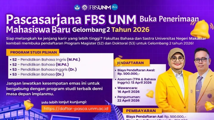 Terkini, Makassar — Fakultas Bahasa dan Sastra (FBS) Universitas Negeri Makassar (UNM) kembali membuka penerimaan mahasiswa baru Program Pascasarjana untuk jenjang Magister (S2) dan Doktor (S3) Gelombang 2 Tahun Akademik 2026.
