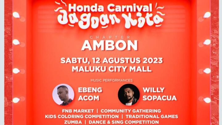 Event Honda Carnival Jagoan Kota bakal dimulai dari kota Ambon, berlangsung di Maluku City Mall, Kota Ambon, Sabtu 12 Agustus 2023.